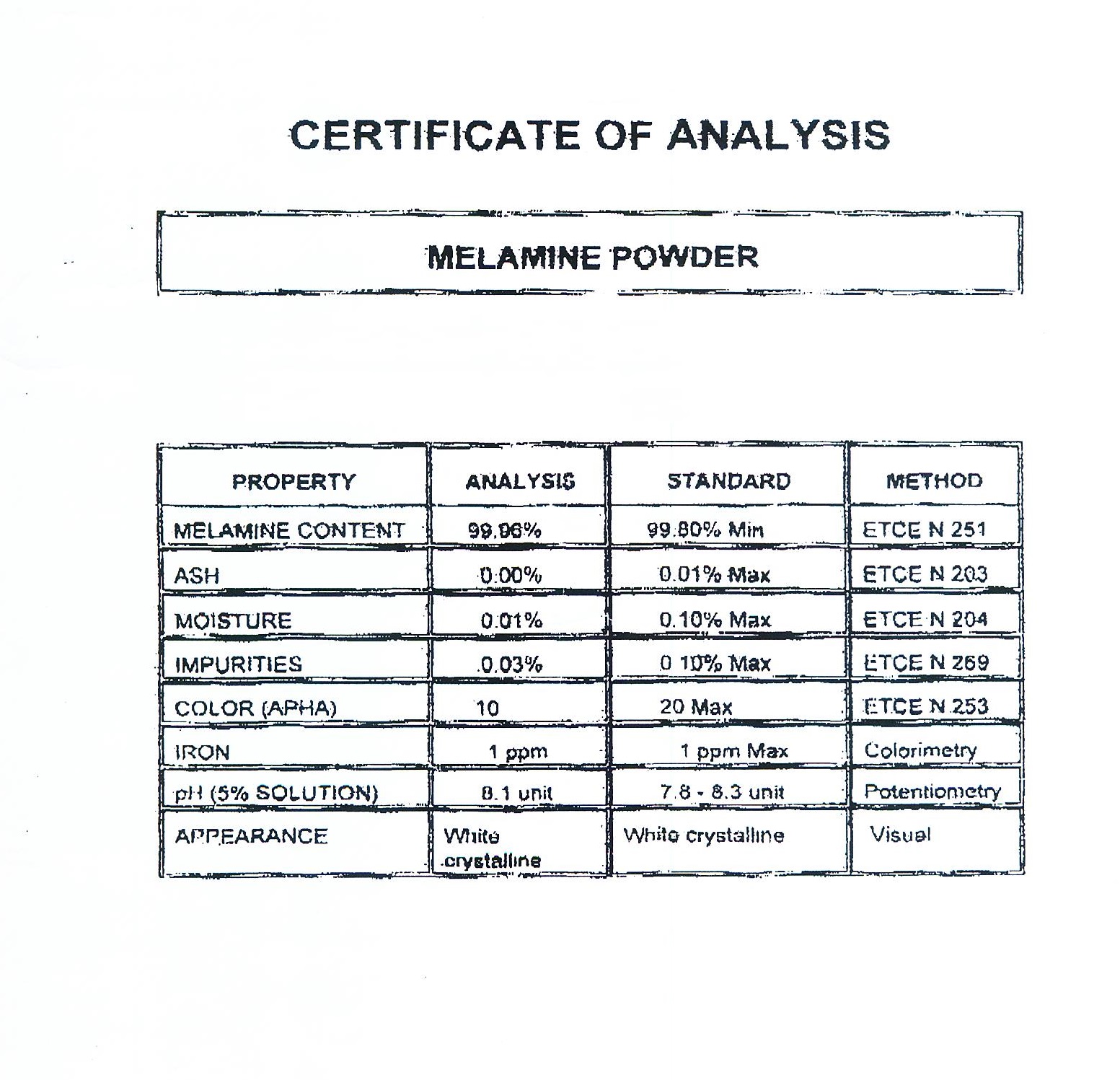 The chemical formula of C3H6N6 is a melanin trimmetric cyanamide and is synthesized in 1834 by the German chemist Liebig. It is a non-toxic chemical at low doses. In infants, the dose was determined as 0.5 mg / kg body.
