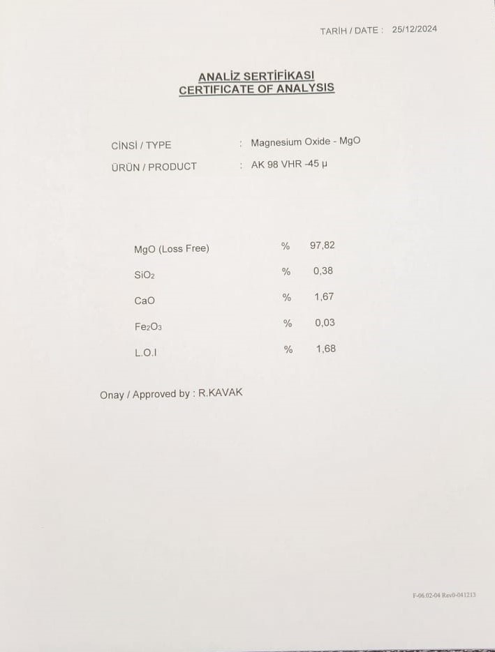 Çözünürlük: Suda çok az çözünür; suyla temas ettiğinde yavaşça magnezyum hidroksite dönüşür.