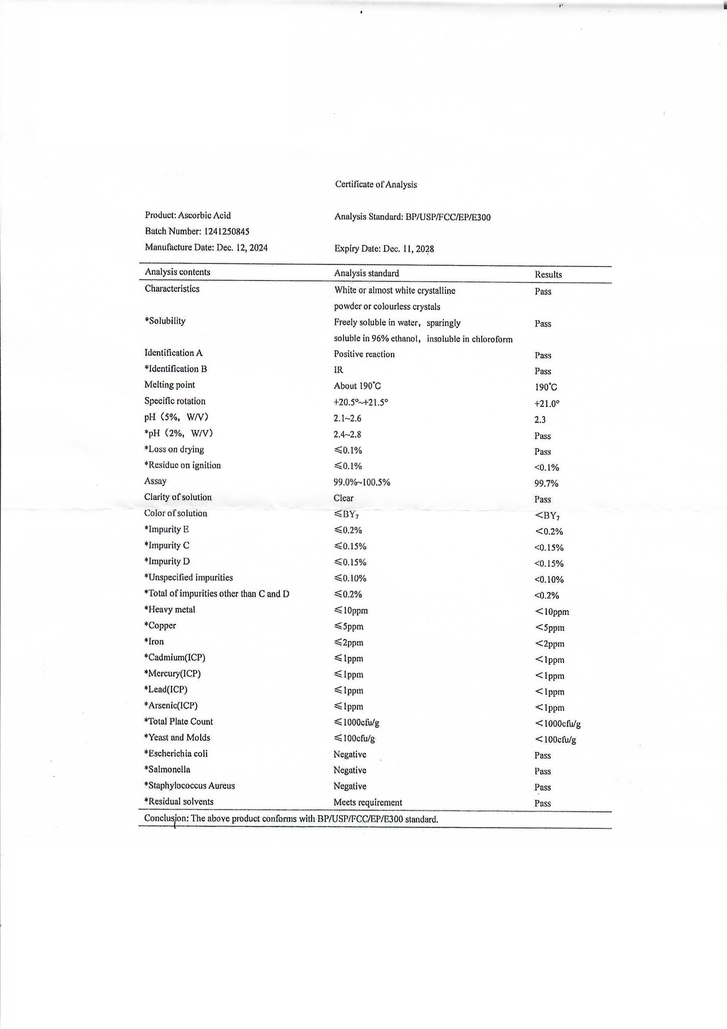 Askorbik Asit, suda çözünen doğal bir vitamindir (C Vitamini). Kloroform, benzen, benzen eteri,petrol eteri ve yağ gibi maddelerde çözünmez.Askorbik asit bir monosakkarit türevidir ve diğer altı karbona sahip monosakkaritlere benzer. Renksiz, beyaz renkli , dikdörtgen şeklindeki kristallerdir. Çok hafif hoş bir kokusu vardır. Ekşi tatta ve asidik reaksiyondadır. Optikçe aktif ve polarize ışığı sağ yöne çevirir. Asetonda çok az çözünür.