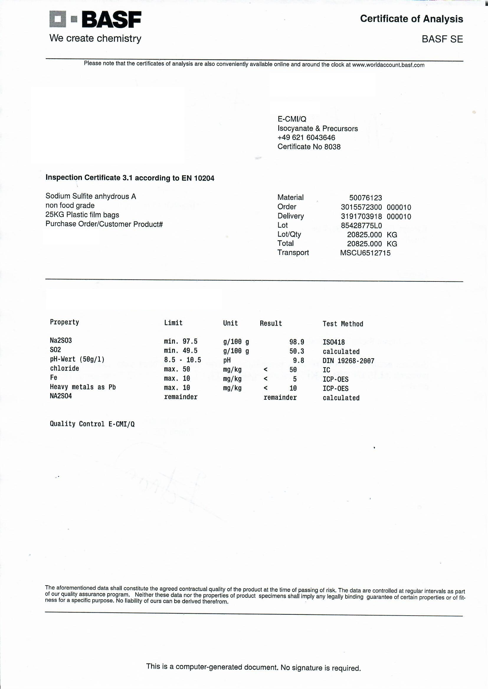 Kimyasal formülü Na2SO3 olan beyaz,kararsız,koruyucu yapısında indirgen bir kimyasal tozdur.Asidik koşullarda sülfürik asit oluşturur. Renksizleşmeyi ve bozulmayı önlemek için en az oksitleyici ve ağartıcı etmenler kadar iyi bir koruyucu olarak kullanılır.Renksizleşme ile nitelenen bakteriyel bozulmayı maskelediği gibi, et ürünlerinde kullanılmasına izin verilmemesine rağmen et içerisinde kararmayı önlemede oldukça etkili bir kimyasaldır.